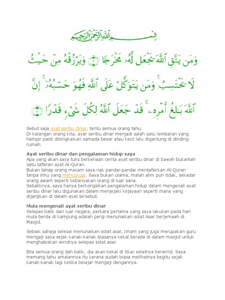 Solusi berkah yang ingin cepat kaya. Ayat seribu dinar berserta maksudnya. Terbukti dengan adanya sebuah kisah menarik di balik penamaan ayat seribu dinar. Diberi nama seribu dinar karena doa ini dipercaya dapat membuka pintu rezeki. Maksud terjemahan bacaan ayat seribu dinar. ومن يتق الله يجعل له مخرجا ويرزقه من حيث لا يحتسب ومن يتوكل على الله فهو حسبه إن الله بالغ أمرهق. Video berikut menjelaskan tentang ayat seribu dinar dan cara mengamalkan ayat seribu dinar sebagai ilmu pesugihan islam. Menurut ibnu katsir, maksud ayat dan barang siapa yang bertakwa kepada allah niscaya dia akan mengadakan baginya jalan keluar dan memberinya rizki. Serta memberikannya rizki dari jalan. Dinamakan ayat seribu dinar adalah karena khasiat ayatnya yang konon jika dibaca akan memudahkan kita dalam mencari rizki. Amalan ayat seribu dinar ini, sudah ada sejak zaman dahulu. Amalan mendatangkan rezeki, keselamatan diri, dan kemudahan segala hajat. 0 ratings0% found this document useful (0 votes).