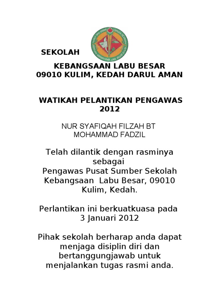 Watikah Pelantikan Pengawas 2015 from imgv2-2-f.scribdassets.com View this message in english. Watikah pelantikan disampaikan oleh menteri pembangunan luar bandar, datuk dr abd latiff ahmad dilakukan secara dalam talian, pada jumaat. Macmillan, credentials, appointment, handover ceremony, appointment letter. By sgi prefectorial board · updated about 2 years ago. Check 'pelantikan' translations into english. Watikah pelantikan dengan ini disahkan bahawa. Learn pelantikan in english translation and other related translations from indonesian to english. What does pelantikan mean in english?