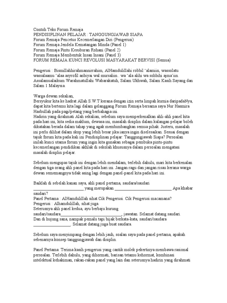 Contoh teks forum remaja pendisiplinan pelajar :